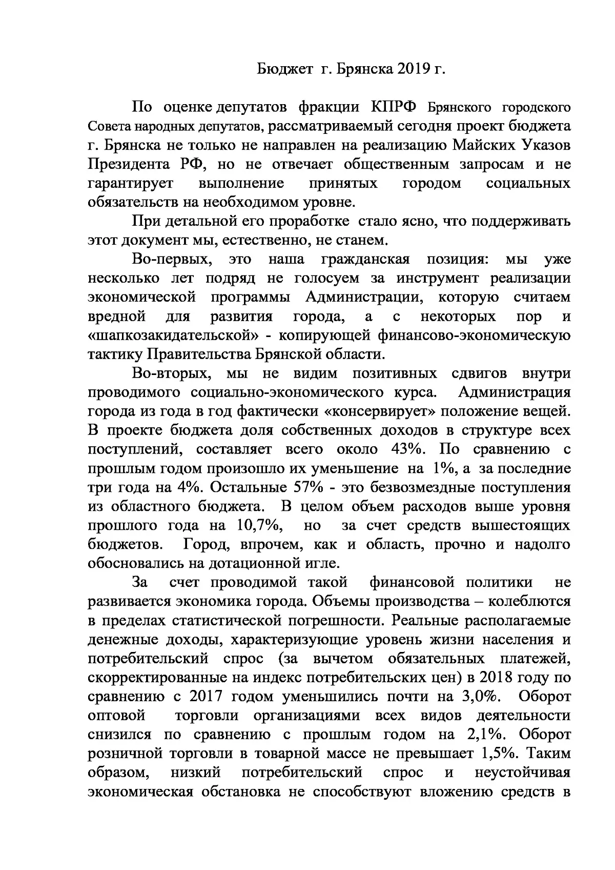 По мнению депутатов-коммунистов проект бюджета Брянска на 2019 год не только не направлен на реализацию майских указов, но и вовсе не отвечает интересам брянцев.