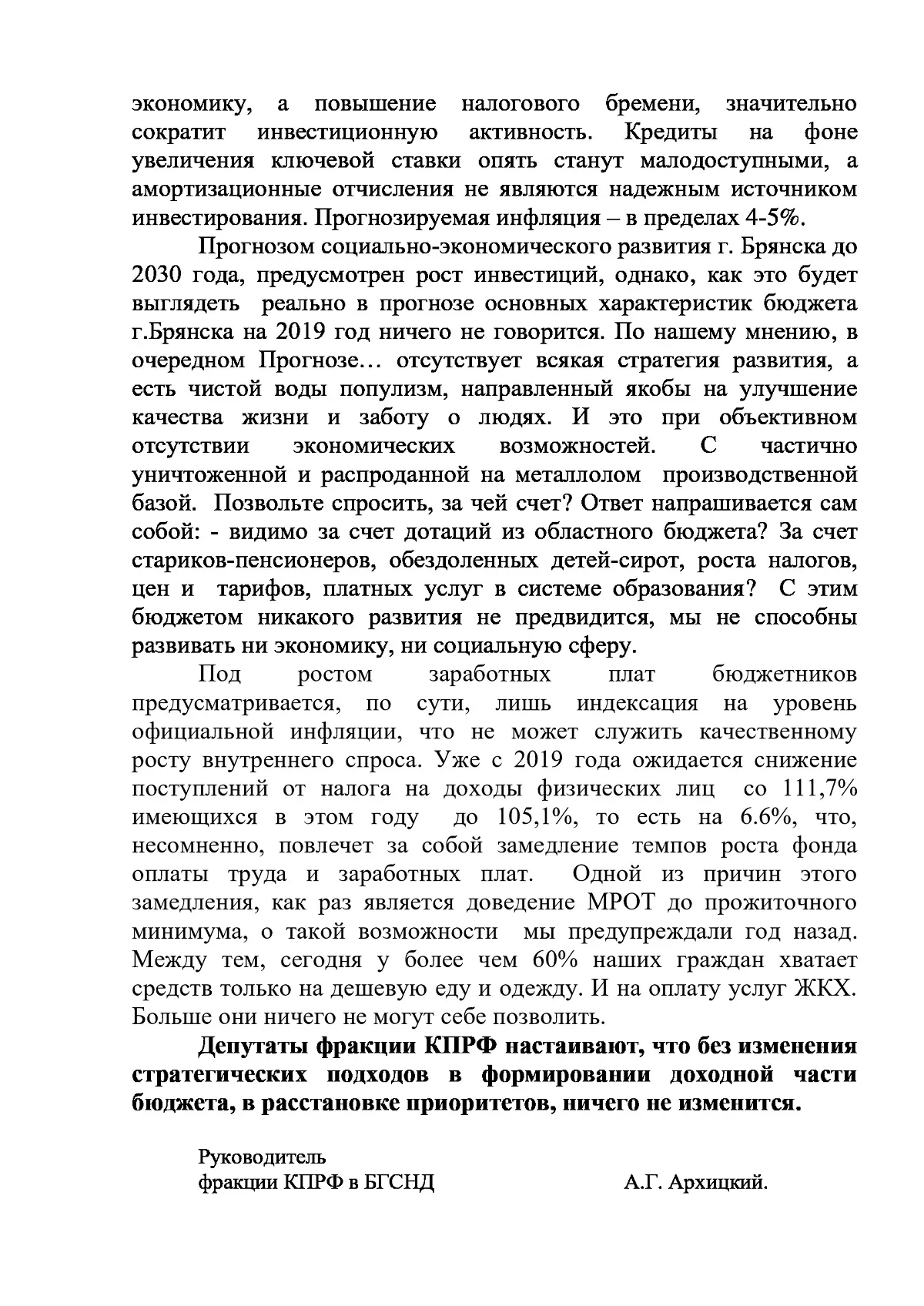 Однако, в процессе обсуждения бюджета, слово попросил народный депутат от КПРФ Андрей Архицкий. Он хотел донести точку зрения фракции коммунистов по ряду спорных и сомнительных положений бюджета города, который, по мнению депутатов от КПРФ, направлен против интересов жителей Брянска.
