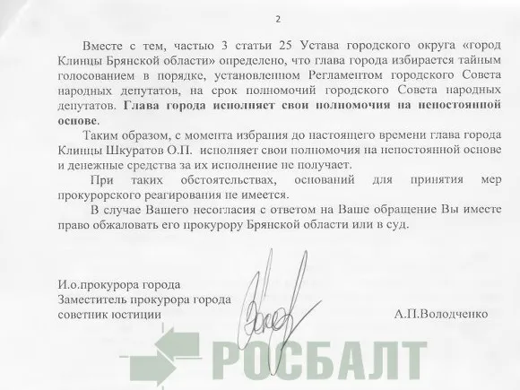 «При таких обстоятельствах оснований для принятия мер прокурорского реагирования не имеется», - отмечается в письме за подписью и. о. прокурора Клинцов Александра Володченко.