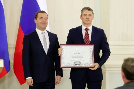 На фото председатель правительства России Дмитрий Медведев и глава Клинцов Олег Шкуратов. Фото с сайта klinci.ru