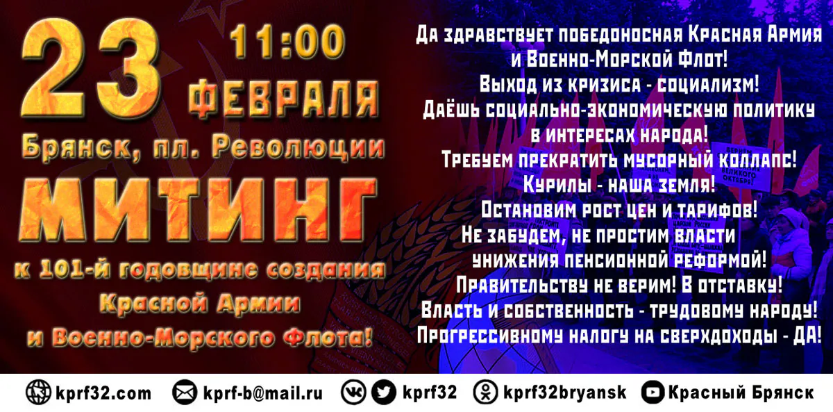 В субботу, 23 февраля в 11:00 на площади Революции в Брянске состоится митинг, посвящённый 101-й годовщине создания Рабоче-Крестьянской Красной Армии и Военно-Морского Флота!