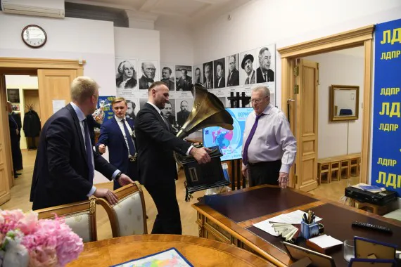 Члены брянской делегации приняли участие в праздновании 30-летия партии ЛДПР в Кремлевском дворце. В честь юбилея брянцы подарили лидеру партии Владимиру Жириновскому современный проигрыватель, стилизованный под граммофон.