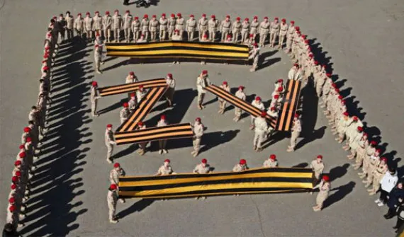 Участники акции выстроились в форме букв V и Z и развернули георгиевские ленты. Волонтеры раздали автомобилистам наклейки с надписями «#СвоихНебросаем».