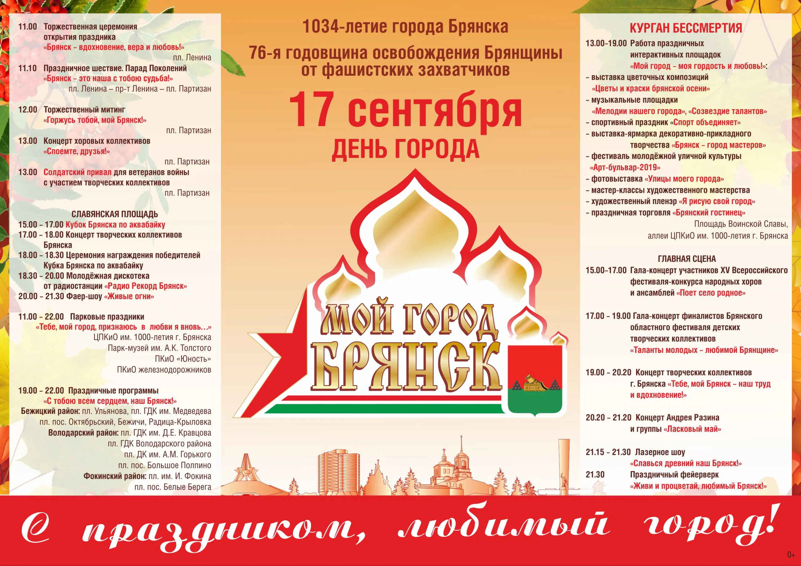 В это же время на Кургане Бессмертия откроется праздничная программа, которая продлится до позднего вечера. С 17.00 до 20.00 пройдёт концерт ведущих творческих коллективов Брянска и области.