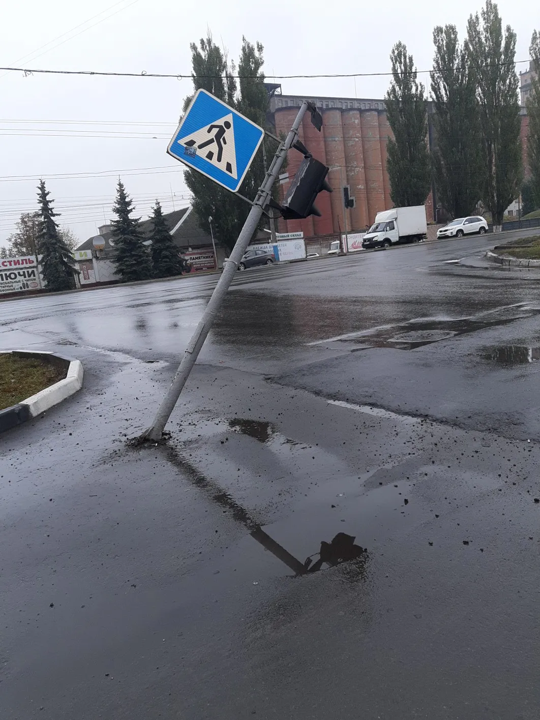 На фотографии видно, как светофор на улице Менжинского в Фокинском районе Брянска опасно наклонился к земле.