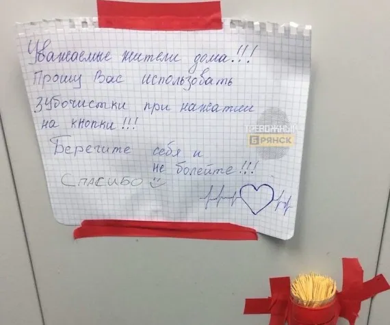 В одном из домов Брянска по улице братьев Ткачевых в лифте сняли на фото объявление об использовании зубочисток при нажатии на кнопки. Такая мера предосторожности связана с распространением в настоящее время коронавирусной инфекции. По всей видимости объявление повесили неравнодушные жильцы дома.
