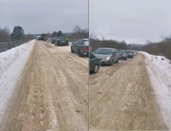 - " Вот опять отличился наш Фокинский мост. Очередная пробка из-за того, что в яме застрял грузовик. Пробка громадная. Ребята толкают все, пытаются что-то сделать. Но, по моему ничего не получается. В очередной раз спасибо нашей администрации, за то что мы стоим на единственном выезде из города Фокина. Сейчас бы главу сюда нашей администрации, пускай бы она потолкала тоже эту машинку. Может быть тогда бы, что-то изменилось бы в нашем городе Фокино - сказала женщина в видео"