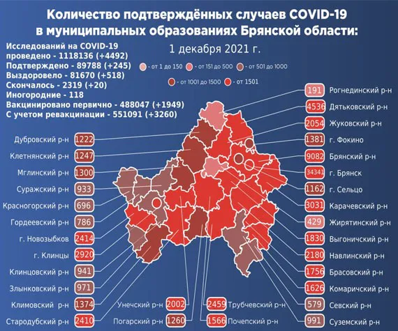 По данным регионального оперативного штаба, к 1 декабря пандемия коронавируса унесли жизни 2319 жителей Брянской области и 118 иногородних пациентов.