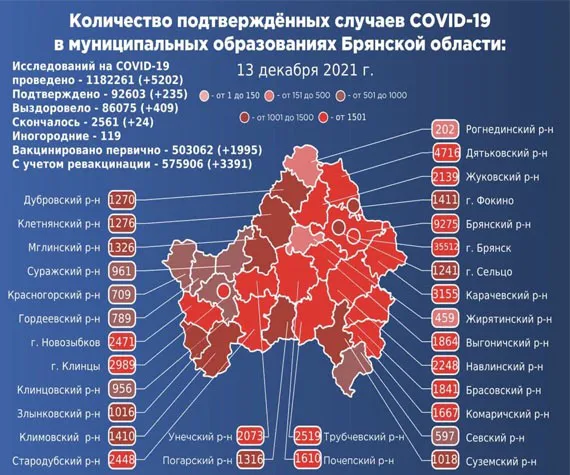 За минувшие сутки в Брянской области провели 5202 исследований на коронавирусную инфекцию. Диагноз подтвердился у 235 человек.