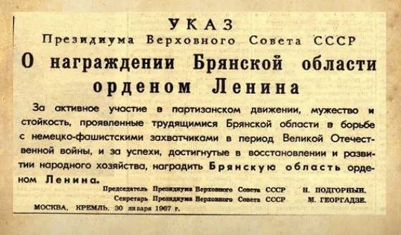 В указе президиума Верховного Совета СССР, в частности, говорится, что награду региону присудили «за активное участие в партизанском движении, мужество и стойкость, проявленные трудящимися Брянской области в борьбе с немецко-фашистскими захватчиками в период Великой Отечественной войны, и за успехи, достигнутые в восстановлении и развитии народного хозяйства».