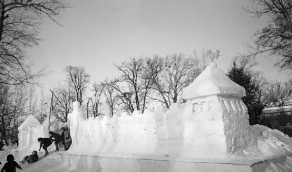На официальной странице облправительства опубликован снимок снежного городка, сооруженного для детей в парке Толстого в Советском районе в 1971 году.