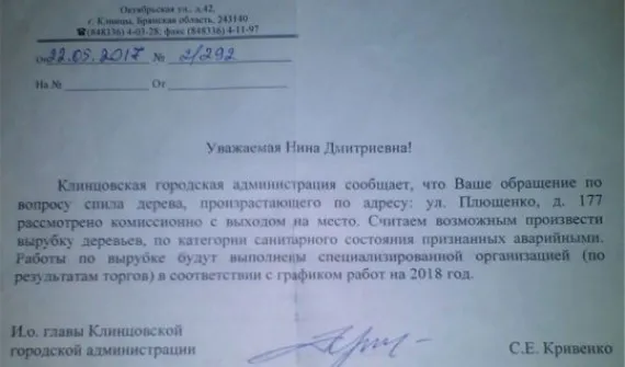 И. о. мэра пообещал автору обращения включить вырубку признанных аварийными деревьев в план мероприятий на 2018 год. Однако, рассказал Сергей Новиков, «прошло пять лет с момента обращения, идет шестой год, а толку нет». Он полагает, что чиновники «наверное, хотят, чтоб на лапу дали».