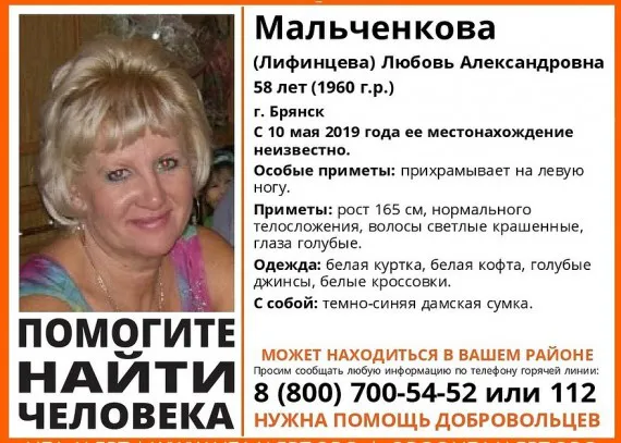 Вот уже почти неделю, с 10 мая, родственники ничего не знают о местонахождении 58-летней жительницы Брянска Любови Мальченковой.