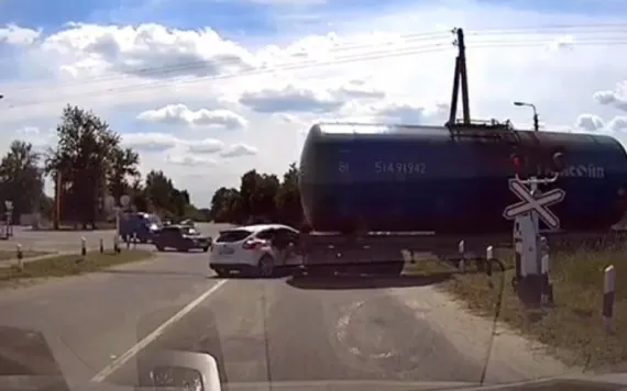 На камеру видеорегистратора попал момент столкновения легкового автомобиля с грузовым составом. Ролик был опубликован в социальных сетях.