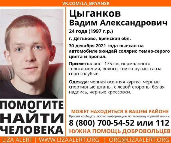 Всех, кто располагает информацией о местонахождении Вадима Цыганкова, просят звонить по телефонам: 8-800-700-54-52 и 112.