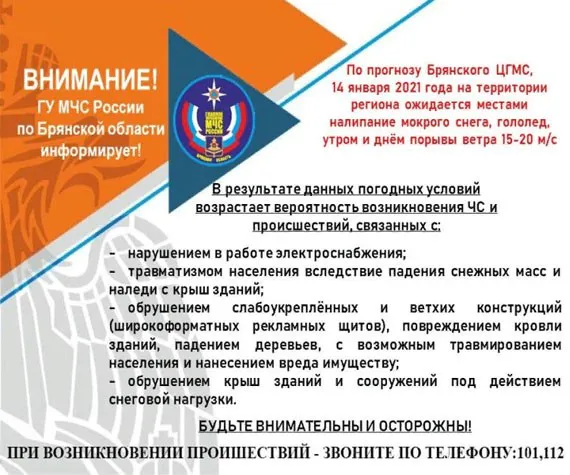 Как сообщает региональное ГУ МЧС, 14 января в Брянской области будет облачно. Ночью небольшие, местами умеренные осадки в виде снега. Днем умеренные осадки в виде мокрого снега и дождя. Местами возможно налипание мокрого снега, на дорогах гололедица.