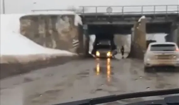 18 февраля в Дятьково грузовик застрял под мостом, перекрыв движение транспорта.