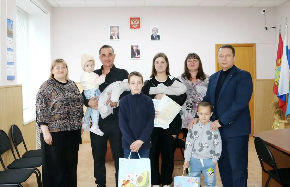 Многодетной семье рассказали о действующих мерах поддержки, вручили свидетельства о рождении сыновей, а также подарки в честь рождения малышей.