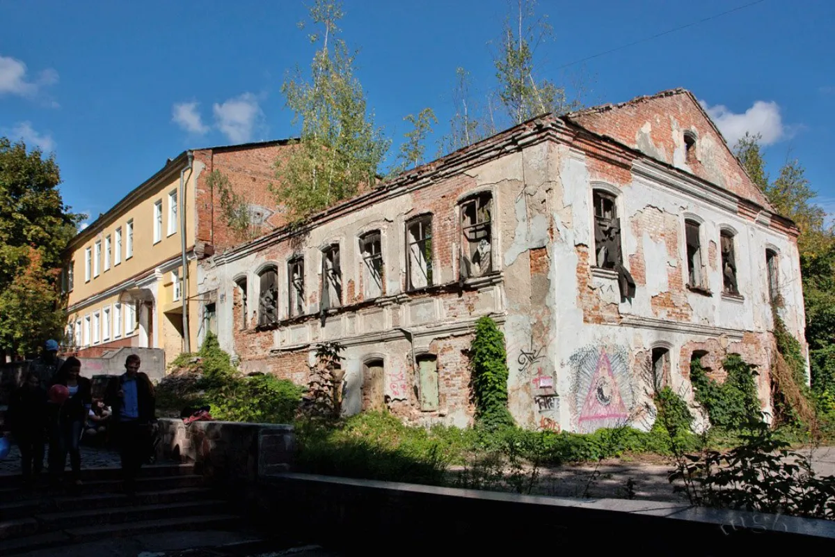 От исторического облика практически ничего не осталось. Фасад затянут баннером с нарисованным изображением «правильного» здания, а за ним скрываются обнажённая кирпичная кладка с осыпавшейся штукатуркой и полуразрушенные стены.
