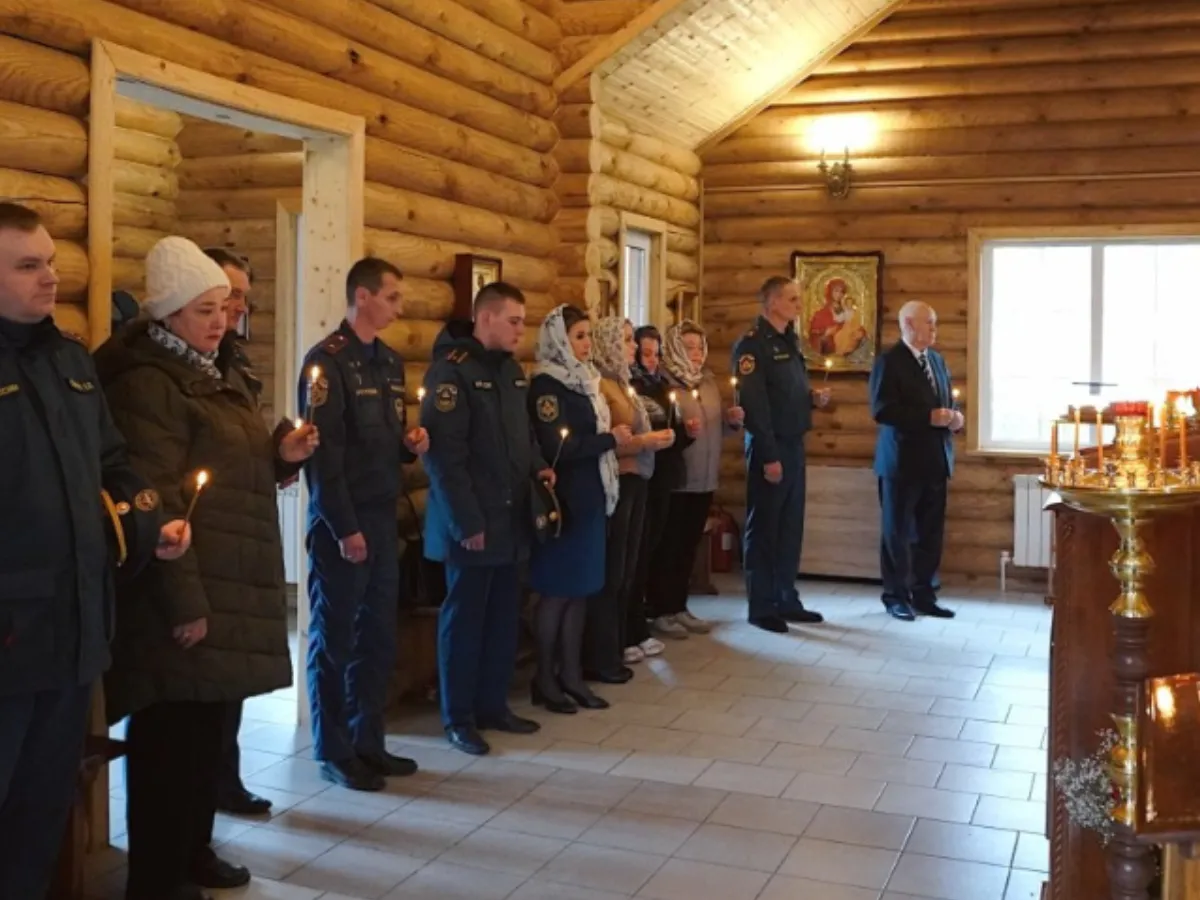 Богослужение совершил настоятель храма иерей Иоанн Выхованец. В храме собрались руководители и сотрудники подразделений МЧС, а также вдовы погибших спасателей.