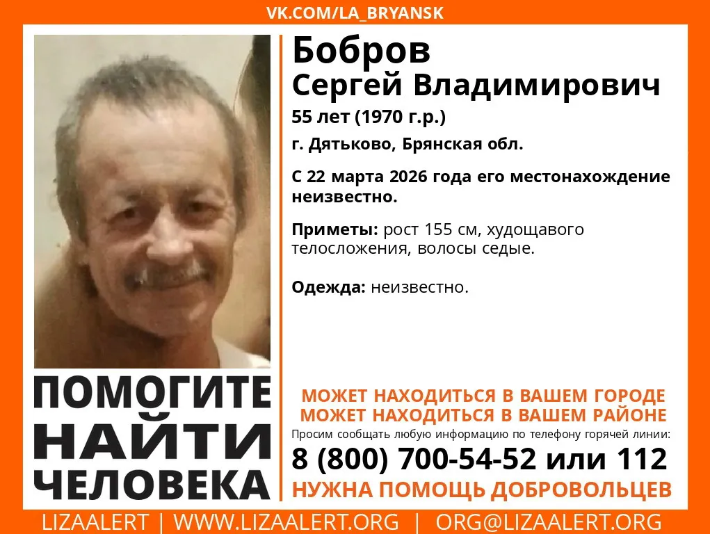 В Дятьково Брянской области ищут пропавшего 55-летнего Сергея Боброва. Местонахождение мужчины неизвестно с 22 марта 2026 года. Информацию о поиске опубликовал поисковый отряд "ЛизаАлерт" по региону в своих социальных сетях.