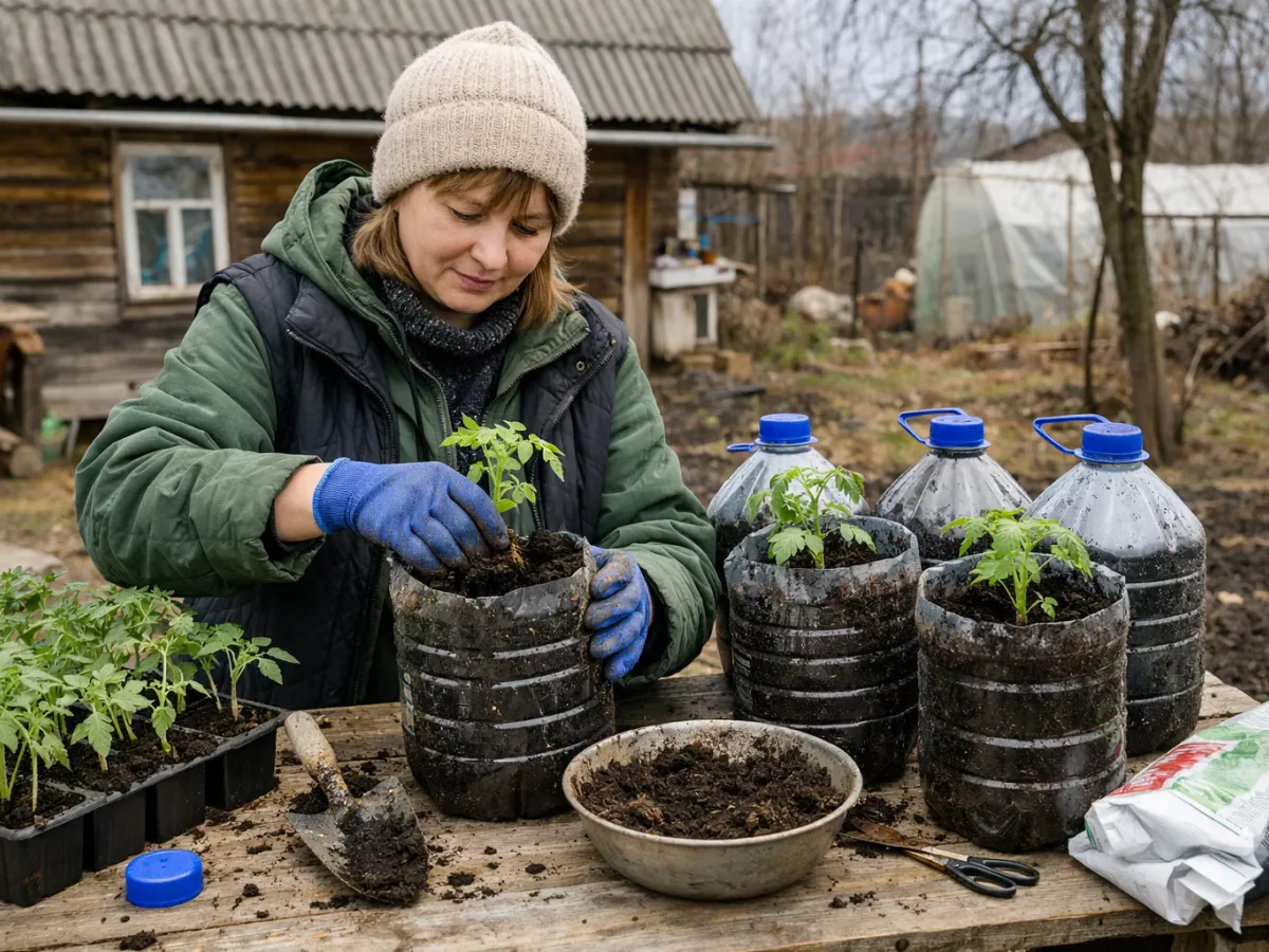 Томату нужно пространство, особенно под землёй. Чем больше корней, тем крупнее плоды и тем раньше они созреют. Сосед по даче поделился секретом: он пересаживает рассаду в пятилитровые бутылки из-под воды. Это почти идеальный горшок: глубокий, просторный и бесплатный.